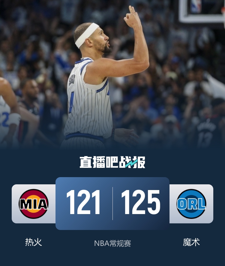 比赛开始,热火反客为主打出10-2开局,但萨格斯和贝恩连续三分迅速回应10-2追平比分,随后双方外线对飙,热火建立领先后被魔术11-0攻击波瞬间追到差1分,次节双方继续对攻战,席尔瓦连得7分助魔术反超比分,但热火连续攻击内线回应,半场魔术领先4分。下半场,双方展开拉锯战,比分多次打平,热火全民皆兵再次建立微弱领先,但魔术也能回应,鲍威尔抛投助热火三节反超1分,末节席尔瓦继续有发挥帮助魔术咬住比分,比赛进入白热化,维金斯三分追平,但萨格斯后仰中投加贝恩两罚再次领先,小卡特关键前场篮板两罚全中杀死比赛,最终魔术125-121险胜热火。