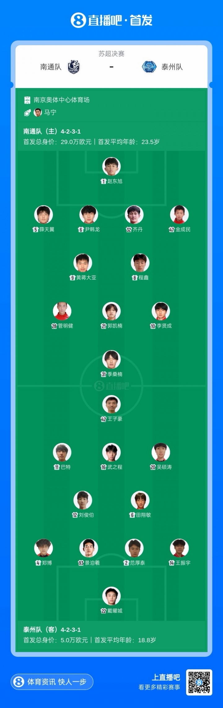 南通队首发:1-赵东旭、5-薛天翼、6-尹韩龙、32-齐丹、47-金成民、8-程鑫、10-李贤成、31-季桑楠、9-黄蒋大亚、21-郭凯楠、28-管明健