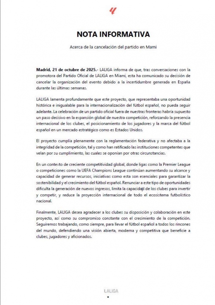 西甲联盟发布声明称,经与迈阿密官方联赛赛事主办方磋商,鉴于西班牙过去数周内产生的不确定性,主办方已决定取消本次赛事组织。