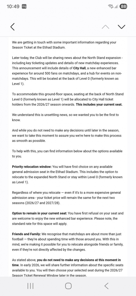 曼城俱乐部已通知部分季票持有者,由于北看台扩建计划,他们当前的座位将受到影响。俱乐部将在北看台0层——原1层——后部新建一个名为“市政厅”City Hall的增强型酒吧体验区及活动中心,该区域从2026/27赛季起将分配给新的持票人,这直接影响了收到通知球迷的现有座位。
